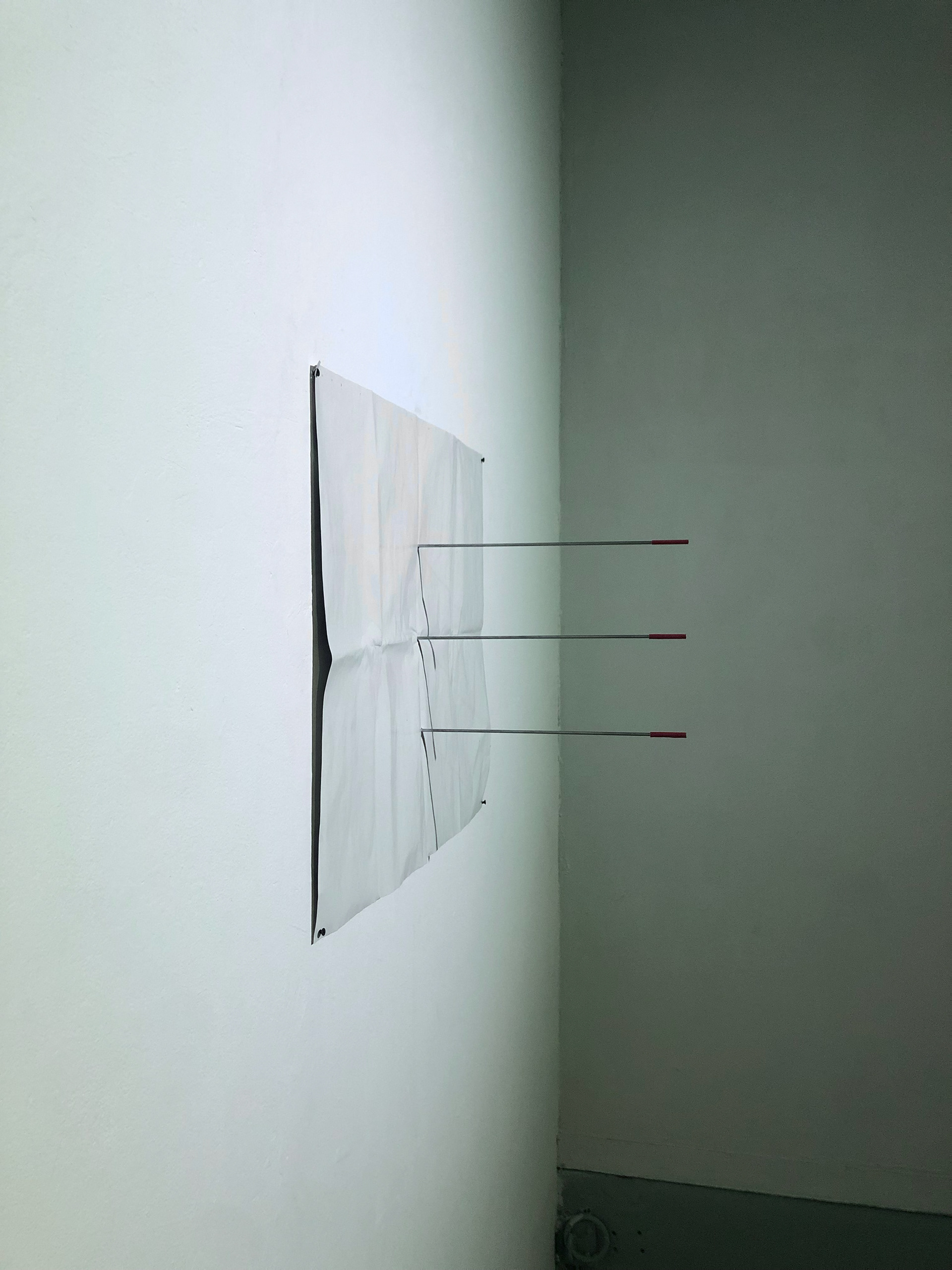 White paint on newspaper, metal arrow