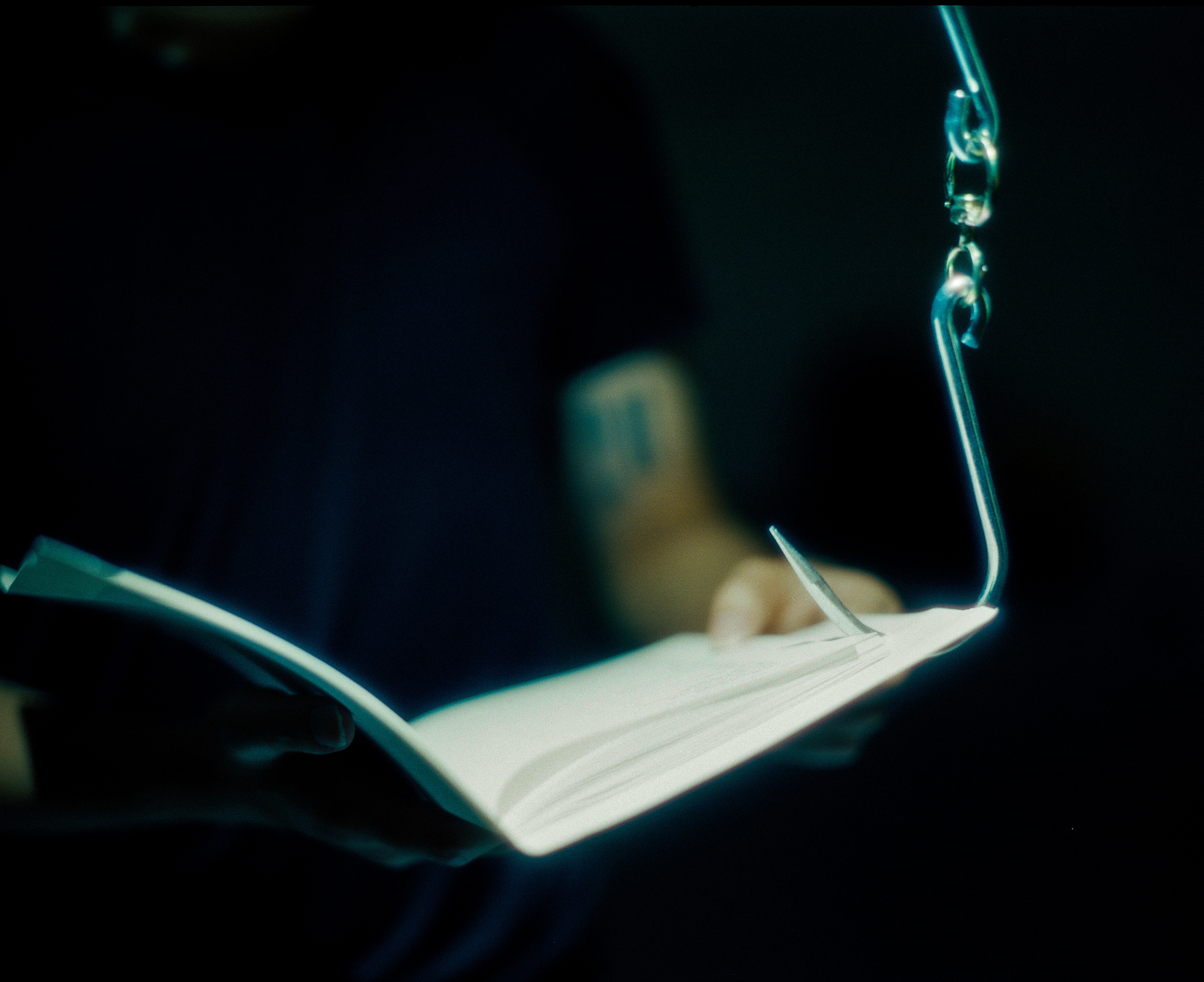 Paper book, metal hook, and nylon strap