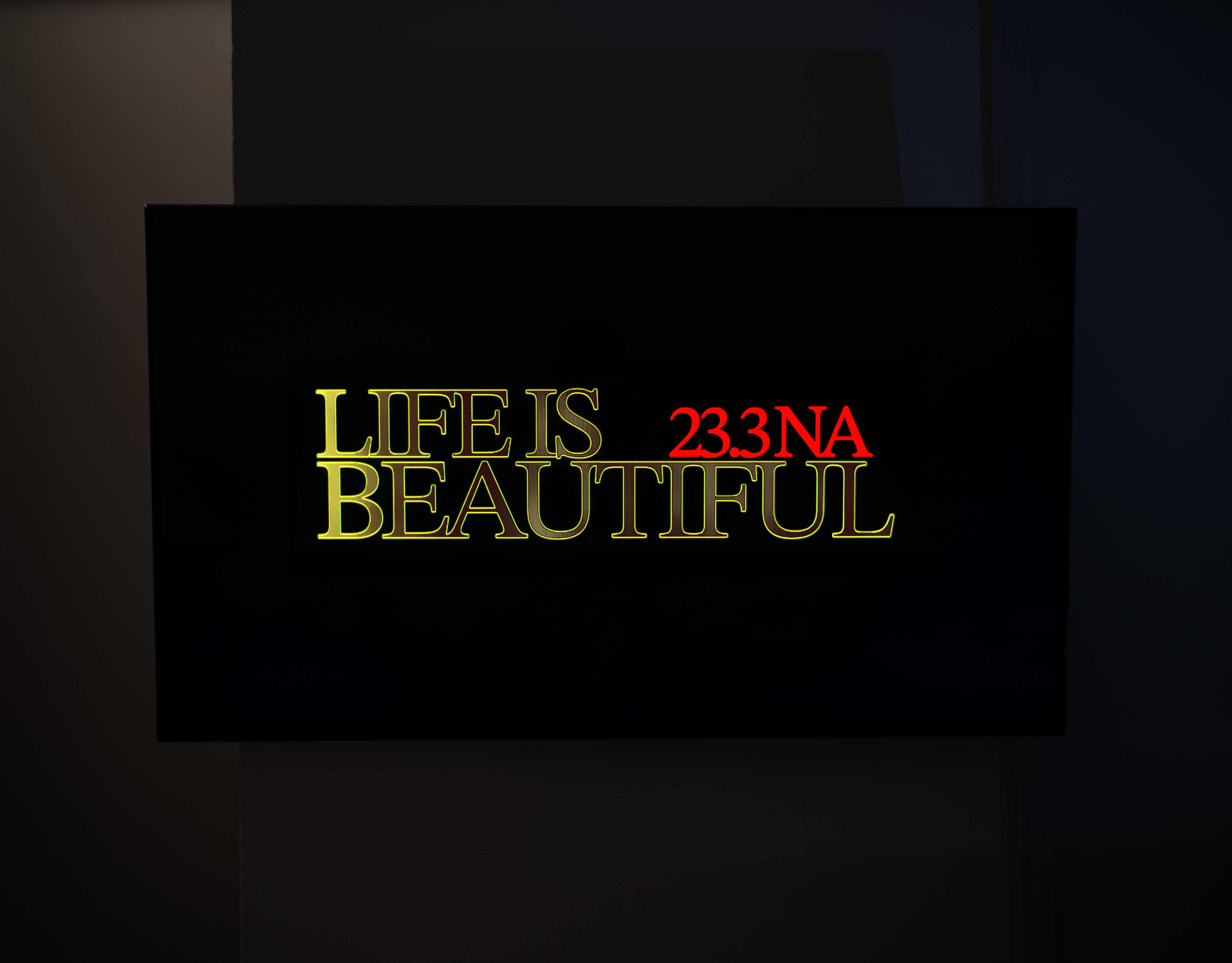 The single-channel video “Life is Beautiful 23.3 NA” is a montage of news footages, gameplays, Instagram “reels”, re-re-re-recorded TikToks, et cetera, mostly acquired between 2020 and 2023, composing a sensational flow of real life events.